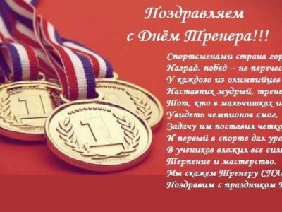С Днём тренера! Уважаемые коллеги пусть Ваши воспитанники будут перспективными, медали золотыми, а места — призовыми. Крепкого здоровья, спортивных успехов, побед и оптимизма!